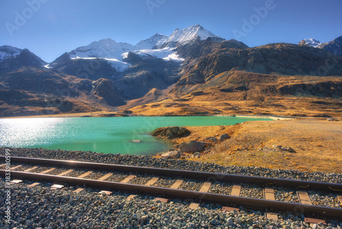© den-belitsky, Obraz premium Scenic railway tracks running along turquoise lake Bianco with snowy alpine peaks on autumn sunny day. Swiss Alps landscape near Bernina Pass, train route in Switzerland. Railway station. Travel