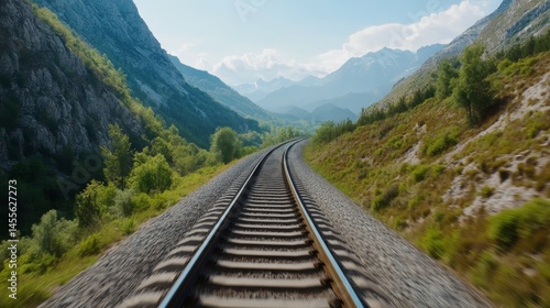 Fototapeta premium Scenic railway tracks winding through lush mountains under a clear blue sky...