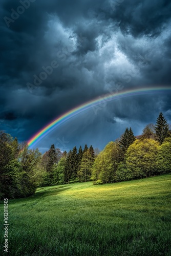 © Afsana, Naklejka premium Scenic Rainbow Arch Across Meadow Field Under Clear Blue Sky Symbolizing Hope and Renewal