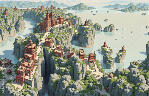 © 威宇 沈, Fototapeta premium Scenic Red Buildings amidst Mountains and Waters