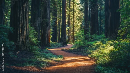 Fototapeta premium Scenic redwood forest trail sunlight path nature walk hiking calm park trees...