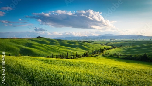 Fototapeta premium Scenic rice field landscape with green meadows, rolling hills, and distant mountains under a blue sky with fluffy clouds