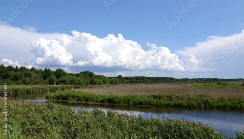 © Tini, Fototapeta premium Scenic river bend, lush greenery, puffy clouds
