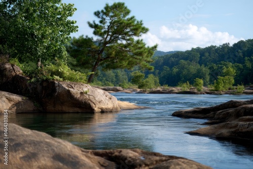 © El Media, Fototapeta premium Scenic River Flowing Through Rocky Landscape with Lush Green Forest