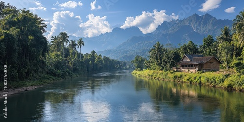 Fototapeta premium Scenic river landscape with lush greenery, mountains, and a cozy cabin under...