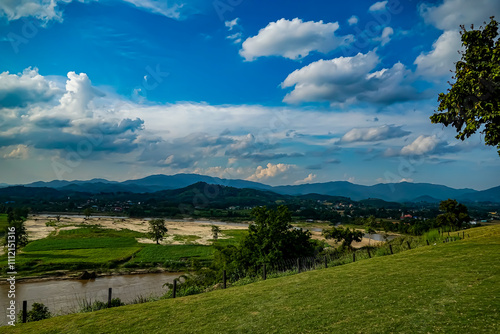 Fototapeta premium Scenic river landscape with rolling hills and dramatic clouds in a...