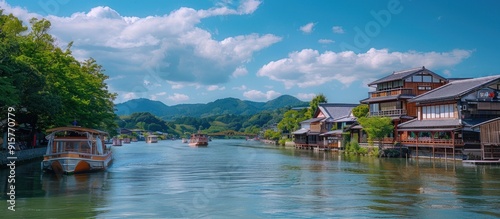 Naklejka premium Scenic River View with Traditional Japanese Houses and Boats
