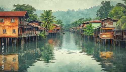 Fototapeta premium Scenic river village, stilt houses, calm water.