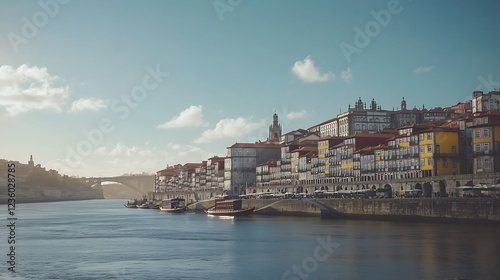© projek, Fototapeta premium Scenic riverside view of colorful buildings and a bridge under a clear sky.