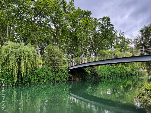 © AS Photo Family, Fototapeta premium Scenic riverside view with footbridge surrounded by lush greenery