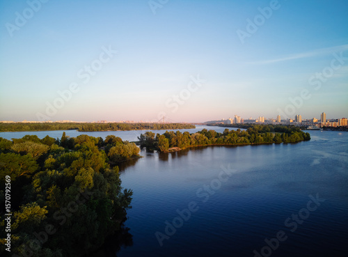 © Loginova, Fototapeta premium Scenic Riverside View With Lush Greenery and Urban Skyline in the Distance