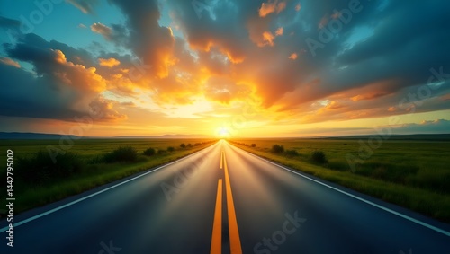 Naklejka premium Scenic Road at Sunset with Glowing Sky – Vibrant Landscape Photography with...