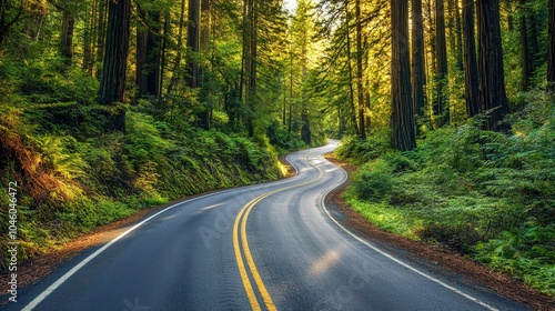 © Sultanaa, Obraz premium Scenic road in Redwood National Forest with vibrant greenery, panoramic view