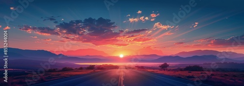 © olegganko, Fototapeta premium Scenic Road Leading Through Field Towards Mountain Lake at Sunrise