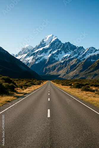© edu_mngs, Fototapeta premium Scenic road leading to snow-capped mountains under clear sky