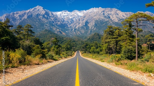© Chananporn, Fototapeta premium Scenic road leads through lush trees towards majestic mountains in blue sky.