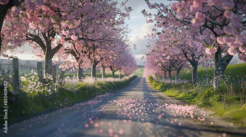 Naklejka premium Scenic road lined with blooming cherry blossom trees in full bloom, petals...
