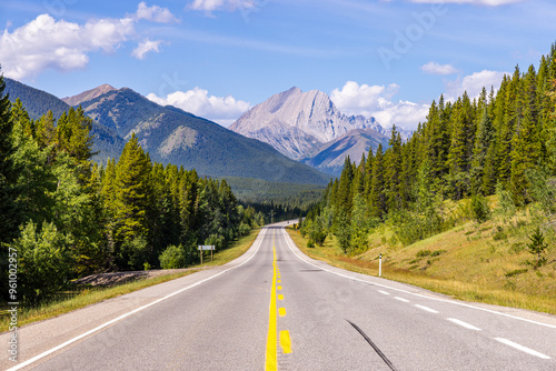 © edb3_16, Fototapeta premium Scenic Road through Majestic Mountains in Kananaskis, Alberta, Canada with Clear Blue Sky and Vibrant Greenery