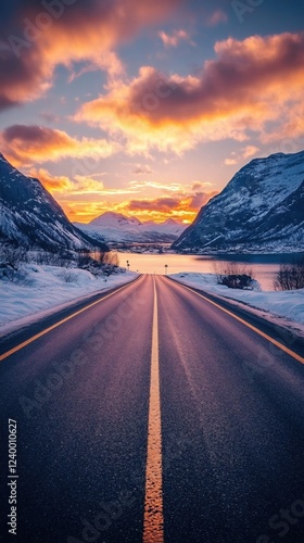 © Duskcraft, Fototapeta premium Scenic Road Through Snowy Mountains at Sunset with Vibrant Sky and Golden Reflecting Light