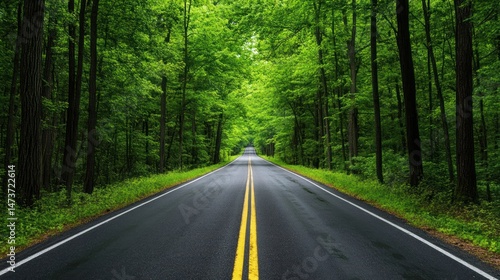 Fototapeta premium Scenic roadway through a lush forest canopy with dense, green trees casting...