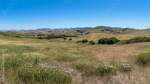 © Kitta Studio, Obraz premium Scenic Rolling Hills with Sunny Blue Sky and Wildflower Meadow