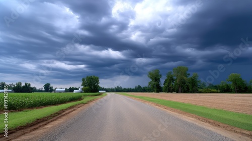 © Matcha_09, Fototapeta premium Scenic rural road under dramatic stormy sky with dark clouds, lush green fields, and distant trees prime for capturing nature's beauty and tranquility