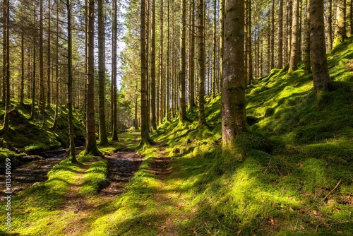 Fototapeta premium Scenic shot of a dense moss covered forest with tall trees
