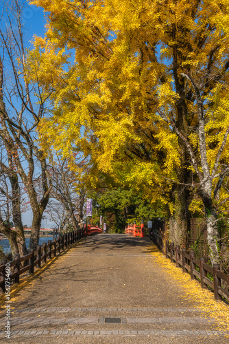 © e55evu, Naklejka premium Scenic sight on a sunny autumn morning along the Uji river in Kyoto, Japan.