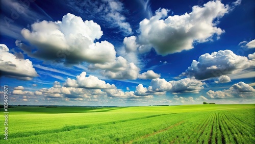 Fototapeta premium Scenic sky with fluffy clouds over green fields at a tilted angle