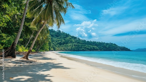 Obraz premium Scenic Southeast Asian beach with white sand and palm trees, tranquil...