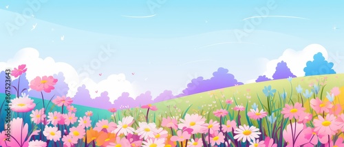 Fototapeta premium Scenic Spring Landscape with Blooming Wildflowers, Colorful cartoon drawing of meadows, hills and blue skies, perfect for nature or seasonal themes.