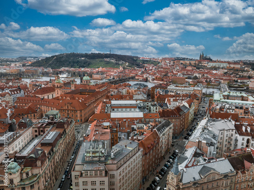 © Aerial Film Studio, Obraz premium Scenic spring panoramic aerial view of the Old Town pier architecture and Charles Bridge over Vltava river in Prague, Czech Republic