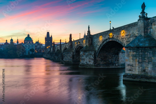 Obraz premium Scenic spring sunrise view of the Old Town pier architecture and Charles Bridge over Vltava river in Prague, Czech Republic