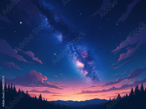© idspopd, Naklejka premium Scenic starry night with hills and forest silhouette background.