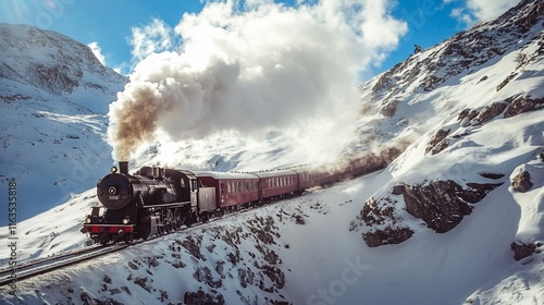 © achmad, Obraz premium Scenic steam train climbs snowy mountain pass.