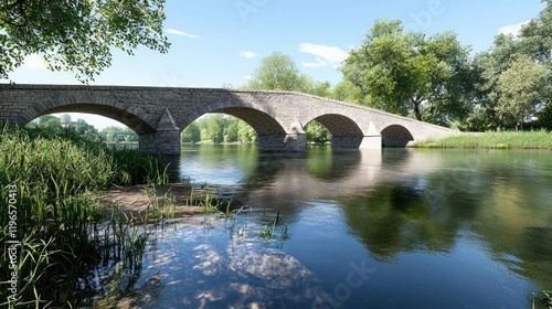 Fototapeta premium Scenic stone bridge over a calm river with lush greenery.