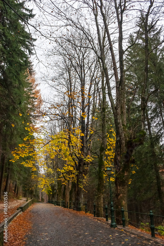 © Tudor Voinea, Fototapeta premium Scenic stone paved street among rusty colors foliage