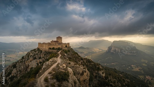 © -Quantum Pixels-, Obraz premium Scenic structure atop a hill in a misty landscape, showcasing preservation