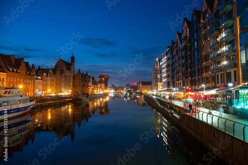 Naklejka premium Scenic summer evening panorama of the architectural embankment pier canal river illumination of the Old Town GDANSK, POLAND
