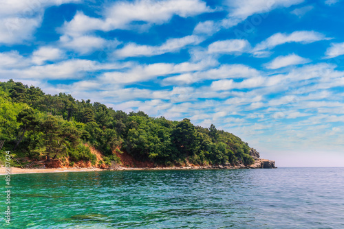 © Yaroslav, Obraz premium scenic summer landscape of beautiful sea shore with water vawes in bay, green forest on isle rock and nice cloudy sky on background