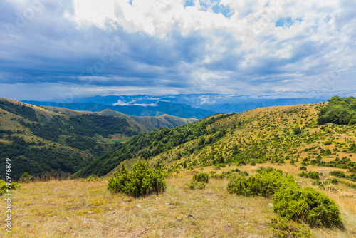 © mitarart, Naklejka premium Scenic summer nature landscape with lush greenery and blue skies with clouds.
