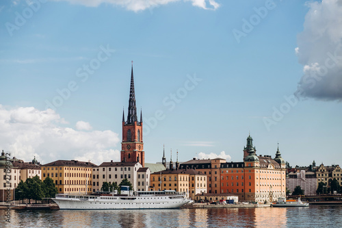 © Stanislav, Fototapeta premium Scenic summer panorama of the Old Town (Gamla Stan) architecture in Stockholm, Sweden. view from Monteliusvagen hill on island Riddarholm and tower of church. Lake Malaren with blue sky, white clouds.