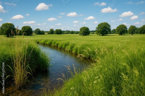 Obraz premium Scenic summer scene with tall grasses and sticks along a brook