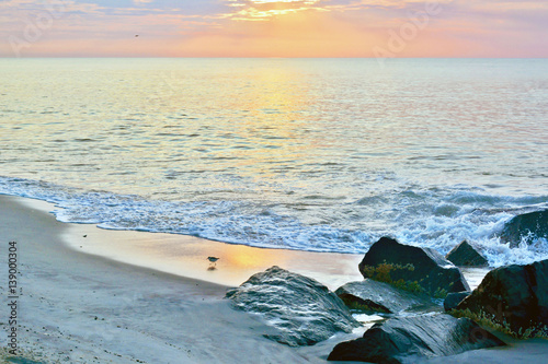 © shauna22686, Obraz premium Scenic Summer Seashore Sunrise Over Rock Jetty on the Beach