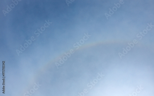 Naklejka premium Scenic sunbeams through the clouds with circular rainbow in the blue sky, Cloudscape
