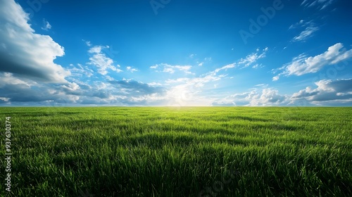 Fototapeta premium Scenic Sunrise or Sunset over Lush Green Grassland Field with Clear Blue Sky and Fluffy Clouds