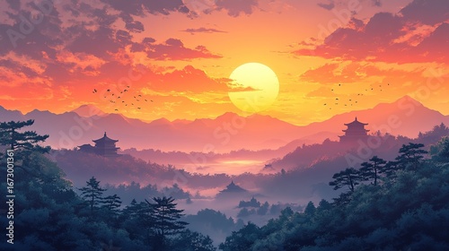 © hgfjggj, Obraz premium "Scenic Sunrise Over Mountains with Traditional Pagodas and Birds in Flight"