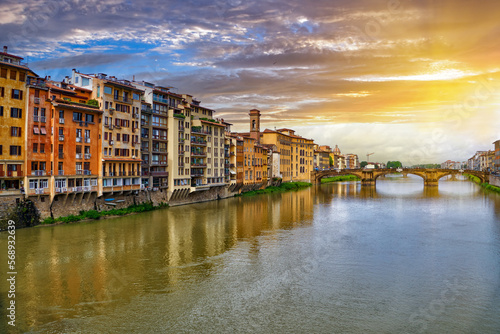 Fototapeta premium Scenic sunset cityscape over Arno River, St Trinity Bridge and colorful old...