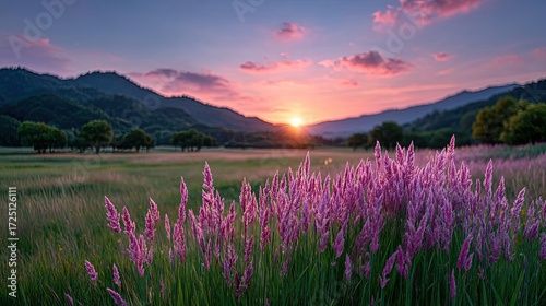 © nanda, Fototapeta premium Scenic Sunset Landscape with Purple Flowers Field and Green Mountains Tranquil Nature Scenery in Warm Light and Soft Clouds