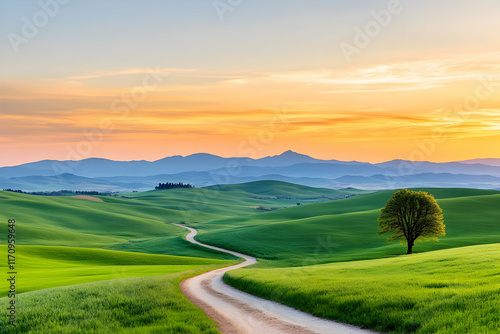 © Phasathon, Fototapeta premium Scenic sunset landscape with winding path and lone tree rolling hills nature photography tranquil environment wide view
